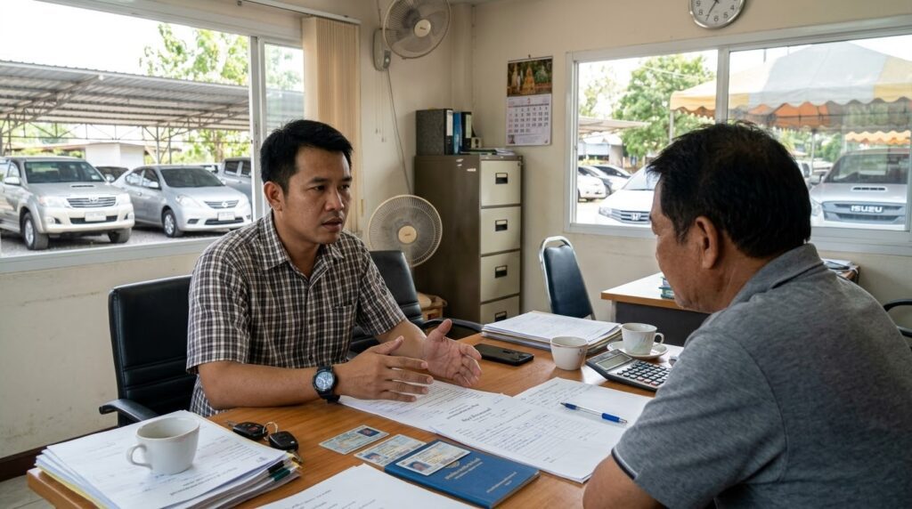 สมุดคู่มือจดทะเบียนรถ หรือที่คนทั่วไปเรียกกันติดปากว่าเล่มทะเบียนรถ (สำหรับรถยนต์จะเป็นสมุดเล่มสีฟ้า) เป็นเอกสารยืนยันสิทธิ์ที่สำคัญที่สุดในการทำธุรกรรม สิ่งที่เจ้าหน้าที่กรมการขนส่งทางบกจะตรวจสอบอย่างเข้มงวดคือ ต้องเป็นสมุดเล่มจริงเท่านั้น ไม่สามารถใช้ฉบับสำเนาทดแทนได้ ภายในเล่มจะบันทึกข้อมูลรายละเอียดของตัวรถ หมายเลขตัวถัง หมายเลขเครื่องยนต์ และชื่อของผู้ครอบครองคนปัจจุบันอย่างชัดเจน